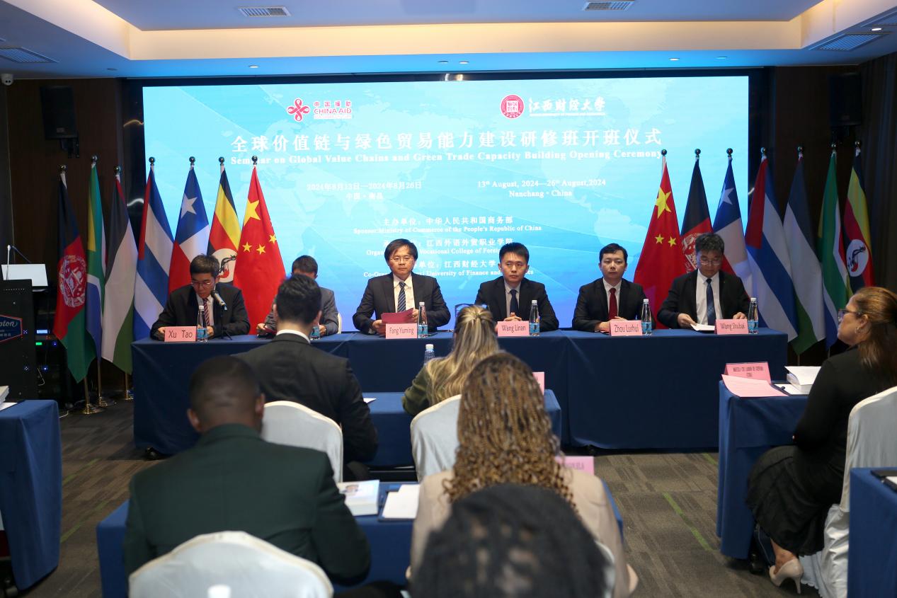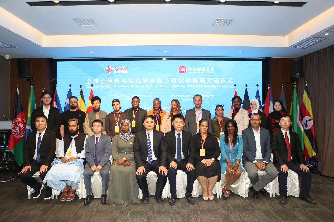 On the afternoon of August 13th, the Opening Ceremony of Seminar on Global Value Chains and Green Trade Capacity Building sponsored by the Ministry of Commerce and jointly organized by Jiangxi University of Finance and Economics and Jiangxi Vocational College of Foreign Studies and Trade was held in Nanchang. Fang Yuming, Member of the Standing Committee of the Party Committee and Vice President of Jiangxi University of Finance and Economics, Wang Linan, researcher of Jiangxi Department of Commerce, was invited to attend the opening ceremony and delivered a speech. Liu Xiaobing, Deputy Director of the Department of International Cooperation and Exchange of Jiangxi University of Finance and Economics, Zhou Lushui, Deputy Director of Training Center of Jiangxi Vocational College of Foreign Trade, Wang Shubai, Vice President of College of International Trade and Economics, and 17 government officials from Chile, Palestine, Jordan, Cuba, South Africa, Uganda and Afghanistan attended the ceremony. The Opening Ceremony was presided over by Xu Tao, director of the Overseas Student Work Office of the School of International Trade and Economics.