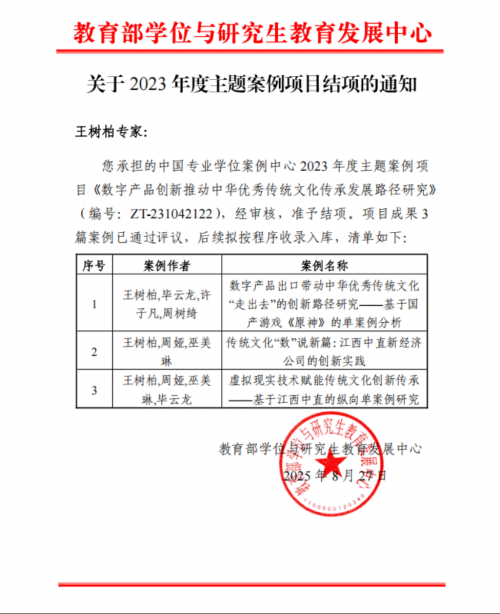 近日,教育部学位与研究生教育发展中心传来喜讯——色漫天堂王树柏老师主持的中国专业学位案例中心2023年度主题案例项目《数字产品创新推动中华优秀传统文化传承发展路径研究》(编号:ZT-231042122),经专家审核准予结项,项目成果已通过评议并拟按程序收录入库。